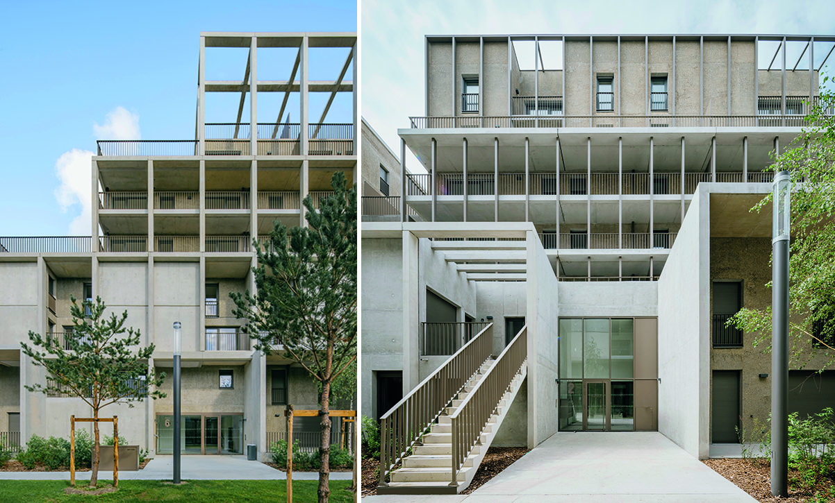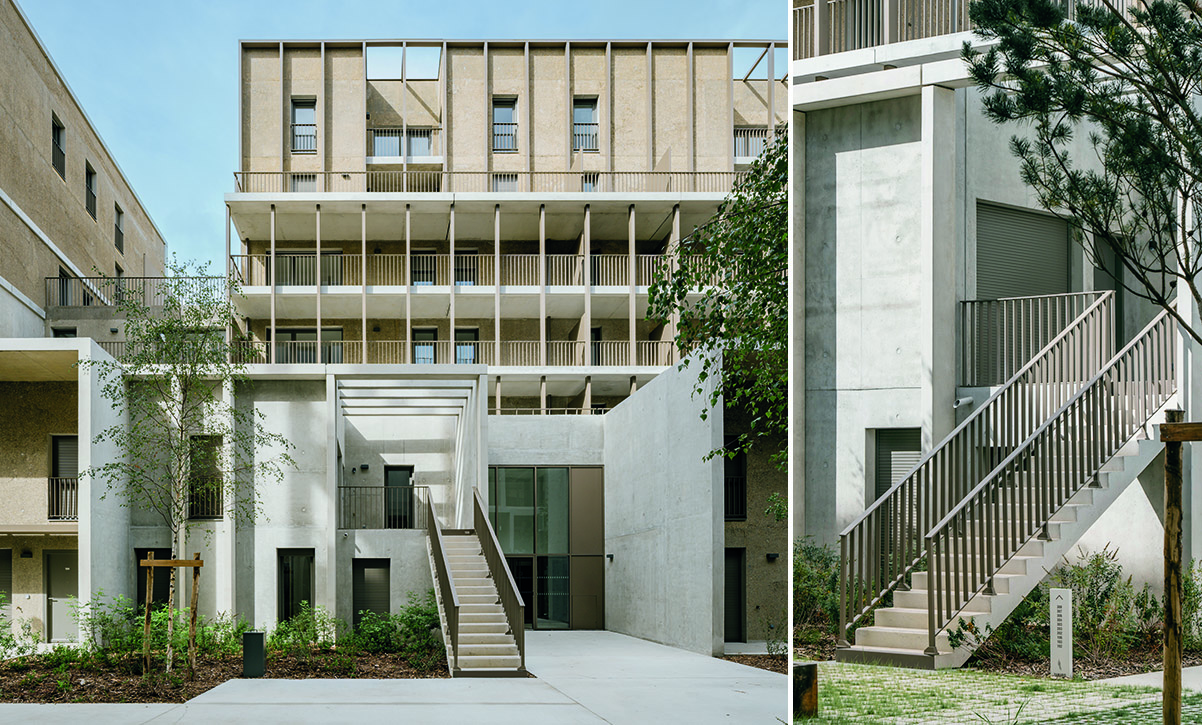 L’architecture développe une morphologie en strates afin de réduire la densité perçue. Chaque logement bénéficie d’un espace extérieur privatif (jardin, balcon ou terrasse), contribuant à la qualité d’usage et à l’animation des façades.