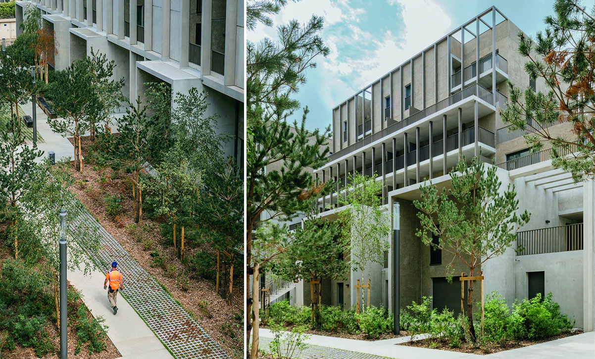Situé à la couture entre quartier pavillonnaire, Parc du Château et centre commercial, le projet s’appuie sur un aménagement paysager structurant, favorisant les continuités vertes, la porosité urbaine et la place du piéton au cœur du dispositif. De nouvelles liaisons douces relient l’avenue de la Somme, le cœur d’îlot et le parc, participant à la reconfiguration globale de Mérignac Soleil.