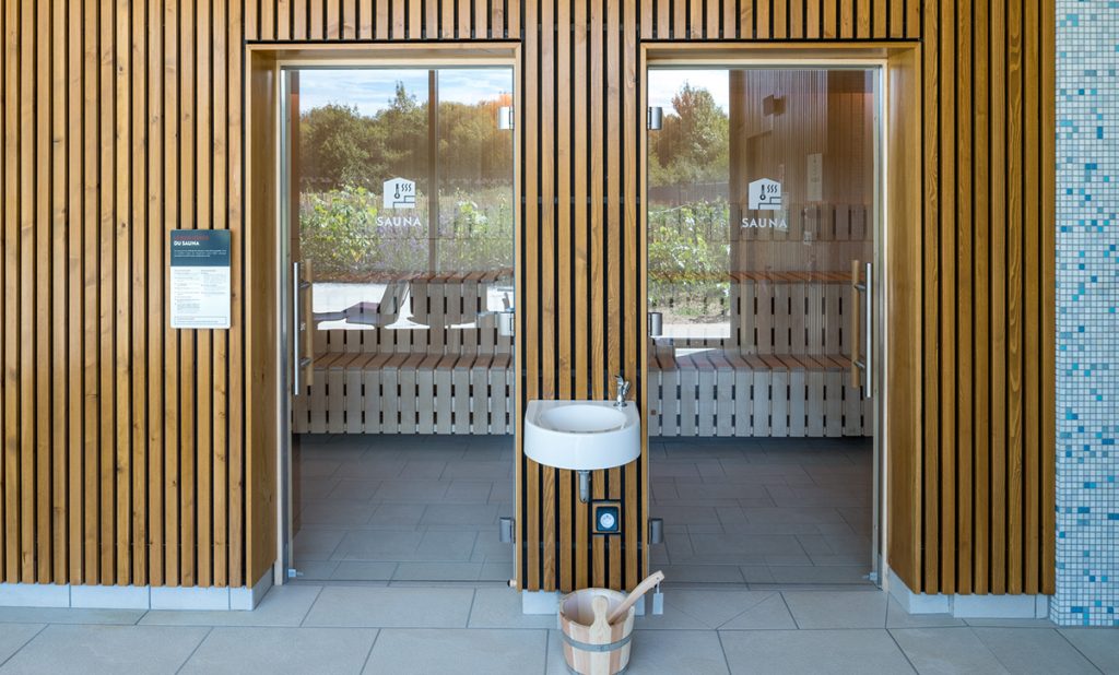 Un espace bien-être doté de deux saunas, d’une baignoire d’eau froide, d’un jacuzzi, d’un hammam au ciel étoilé + une douche sensation + une douche hydromassante + une douche “classique et une plage extérieure dédiée à cet espace. Là encore, un escalier confort permettra d’accéder au jacuzzi permettant au plus grand nombre d’en profiter.